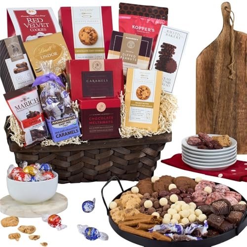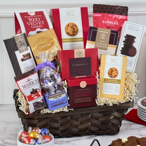 Gourmet treats include chocolate caramels (4.4 oz), assorted chocolates (4 pieces), sea salt chocolate caramels (5.2), chocolate chip cookies (4 oz), assorted chocolate truffles by Lindt (5.1 oz), red velvet cookies (5.5 oz), chocolate wafer cookies (6 oz),