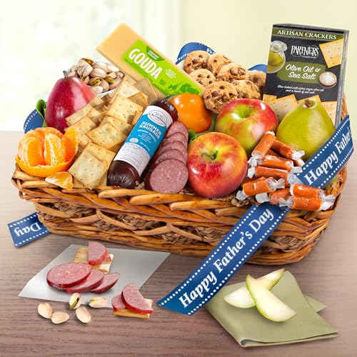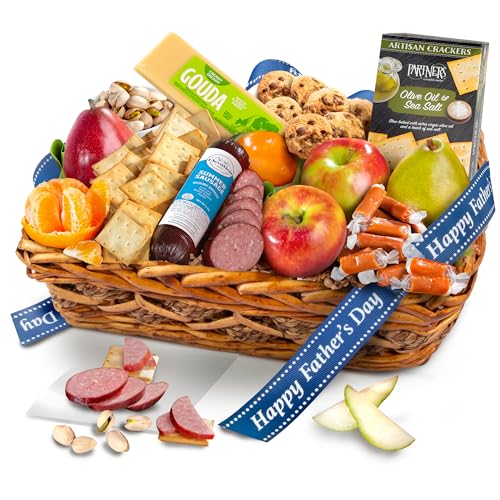 Show Dad he’s #1 with this basket full of gourmet snacks and treats! A delicious assortment of fresh fruits including pears, apples, and citrus are complemented by the classic snack trio of summer sausage, cheese, and crackers. All of this is partnered with pistachios in a drawstring bag and individually wrapped sea salt caramels, all tied with a Happy Father’s Day ribbon, ready for gift giving.
