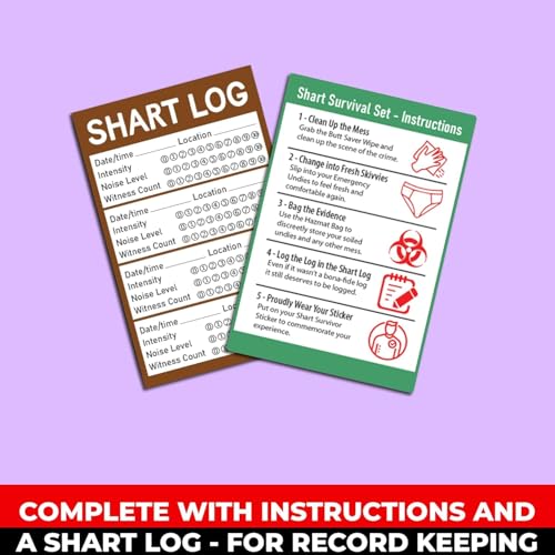 INCLUDES THE FOLLOWING COMPONENTS: Disposable underpants | Butt Saver emergency wet wipe | “I Survived a Shart-O-Calypse” sticker | “Shart Log” record keeping sheet | hazmat bag | Instruction sheet