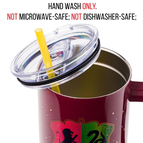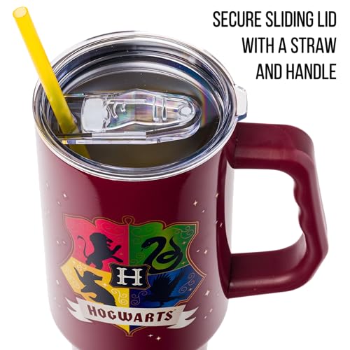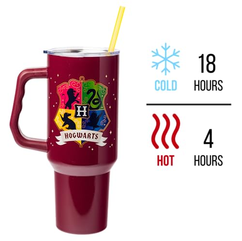 Silver Buffalo Harry Potter Hogwarts House Crest Featuring Gryffindor, Ravenclaw, Slytherin, and Hufflepuff Stainless Steel Tumbler with Handle and Straw, Fits in Standard Cup Holder, 40 Ounces