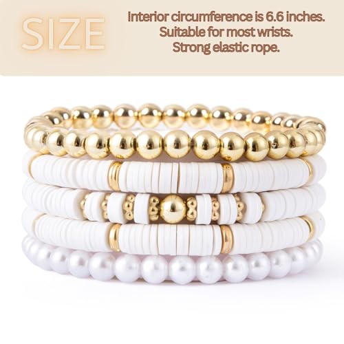 Clay Beaded Bracelets: The inner perimeter of these bracelets is approximately 6.8/7 inches, making them suitable for most wrist sizes. The stackable beaded bracelets are made of premium soft clay, polymer, and acrylic material, with real gold plating. They are not easy to break, waterproof, durable, and lightweight.