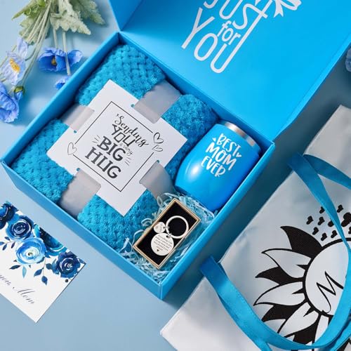 Thoughtful Christmas Gifts for Mom: Inside the beautiful blue mom gift box, you’ll find a stylish canvas bag printed with “Mom,” a 12oz insulated tumbler featuring “Best Mom Ever,” a stainless steel keychain engraved with “Love Mom,” and a luxurious flannel blanket with “this blanket is a hug from me to you. Each item adds a personal touch, making it perfect for mom birthday gifts, Christmas gifts for mom or gifts for wife from husbands to show love and gratitude