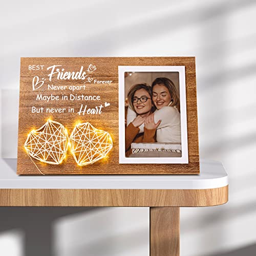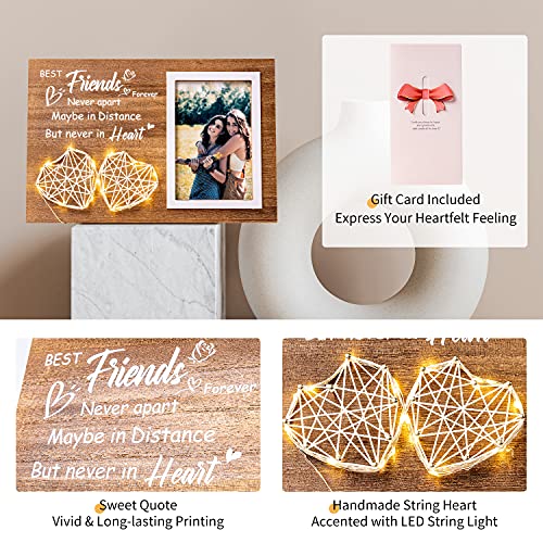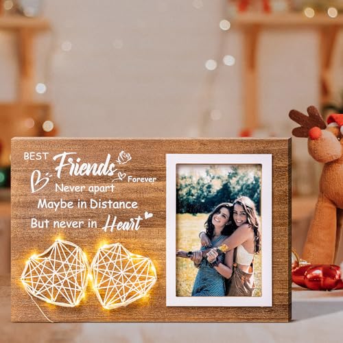 Best Friend Gifts for Women: Express your heartfelt love to your best friend and make them feel warm. This personalized picture frame comes with a sweet quote, “Best Friend Forever Never Apart Maybe In Distance But Never In Heart” and a handmade string heart accented with led string light, making it a cute gift
