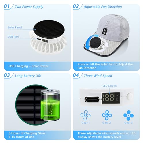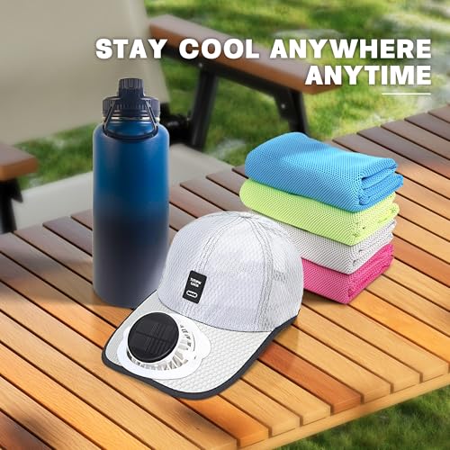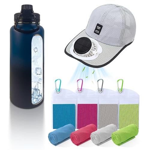 3-Piece Summer Gift Cooling Set, Include Solar Powered Fan Hat, Insulated Water Bottle, Instant Cooling Towels, Perfect for Hiking, Amusement Part, Sport Events, and Outdoor Working Gray