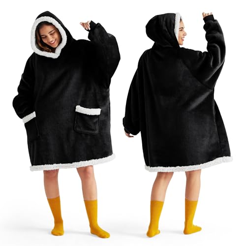 Bedsure Blanket Hoodie, Wearable Blanket for Adults & Kids as Gifts for Women Men, Birthday Gifts for Women Mom Girl Sherpa Oversized Hoodie, Black, Standard