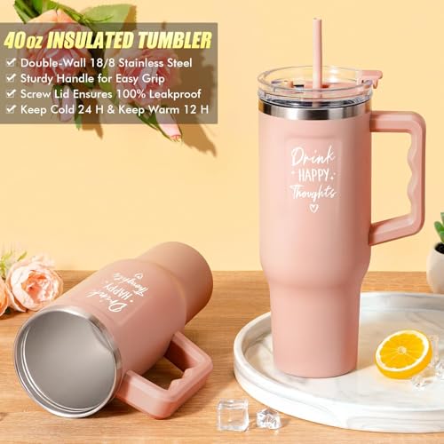 40 OZ TUMBLER WITH HANDLE & STRAW: Qinline insulated tumblers is crafted from premium 18/8 stainless steel, ensuring durability and resistant drops and rusts. It beverage temperature up to 24 hours for cold and 12 hours for hot. The screw lid and airtight seal make sure 100% leak-proof, With a comfortable handle designed for easy to grip and carry along. 40 OZ capacity is perfect for staying hydrated, drink all day along! The energetic quote “Drink Happy Thoughts” adds a motivational touch