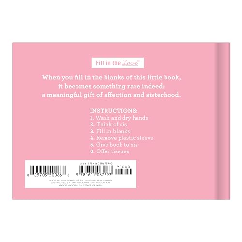 This little book contains fill-in-the-blank lines to describe some aspect of sisterly love about a female sib. Just complete each line and voilà: you have a uniquely personal gift sis will read again and again. Make it as sappy, sassy, or silly as you choose! Knock Knock is an independent maker of clever gifts, books, and whatever else we can think up. Our mission is to bring humor, creativity, and smarts to everyday life. Put the fun in functional with Knock Knock stuff.