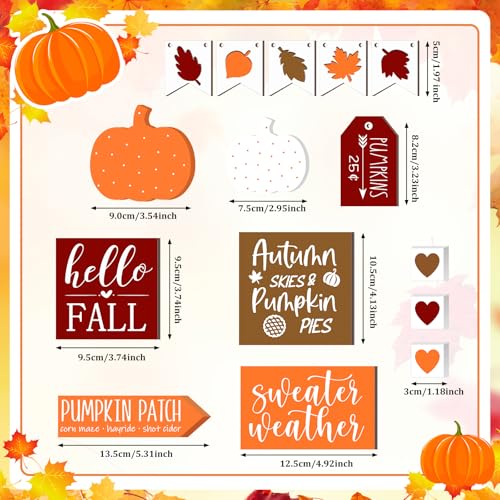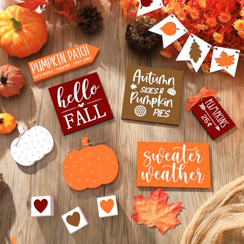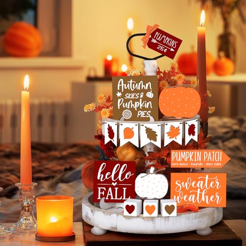 Sumind 15 Pcs Fall Tiered Tray Decor Set Hello Fall Decor Autumn Wood Signs Thanksgiving Orange Brown Table Signs Farmhouse Wooden Maple Pumpkin Gnomes Tabletop for Festival Home(Autumn)