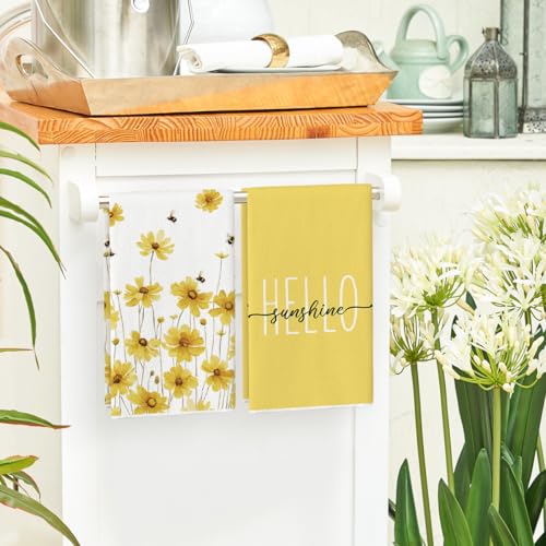 Artoid Mode Yellow Flowers Bee Hello Sunshine Spring Kitchen Towels Dish Towels, 18×26 Inch Summer Holiday Decoration Hand Towels Set of 2