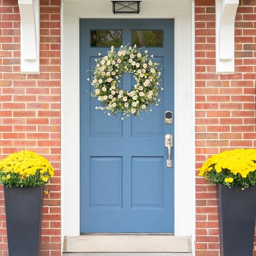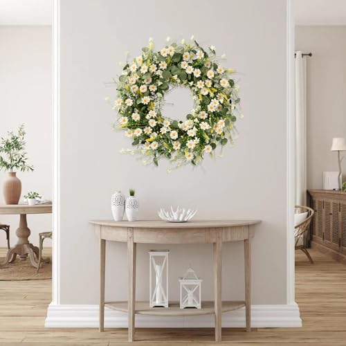 [HIGH QUALITY WREATH]: This artificial white daisy wreath is made of premium plastic and silk. The base is durable natural grapevine full of white daisy, green eucalyptus leaves, jasmine, lavender, clusters of small berries and other wild flowers. The entirely realistic wreath is vivid and vibrant.