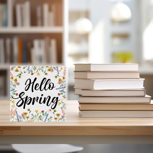 Spring Decor Rustic Hello Spring Flowers Wood Block Sign Farmhouse Home Decorations Living Room Shelf Desk Decor 5 x 5 Inches