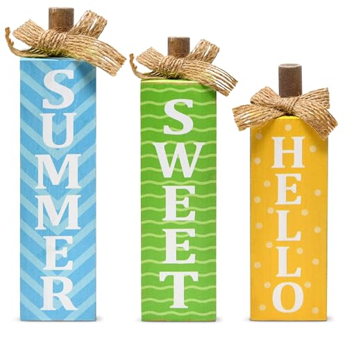 Beautiful Intricate Design: 3 Magnificent summer themed table topper features 3 designs with burlap bows: blue aqua with summer printed on it, green with white sweet printed on it, yellow with hello printed on it; the beautiful and lovely colors will lighten up your home. Place it Anywhere and Everywhere: Adorn your kitchen table, desk, shelf, fireplace, mantle, windowsill or counter top with these adorable pool party decorations; a fun way to decorate for the summer season. Perfect Gift: Present these well designed summer blocks to your loved ones, coworkers, family and friends to liven up their holiday and show how much you appreciate them. High Quality: These hello summer signs are made of solid wood, which is strong and durable, not easy to damage or fade; they are reusable and can be used for a long period of time. Dimensions: The summer toppers comes in 3 sizes measures 6.25″ x 1.4″ x 1.4″, 5.4″ x 1.4″ x 1.4″, 4.6″ x 1.4″ x 51.4″; jJust the right size to make a statement at your beach party and enhance and complete the decor.