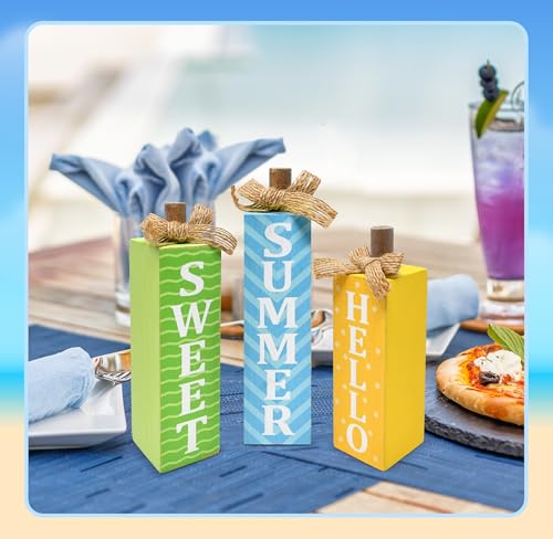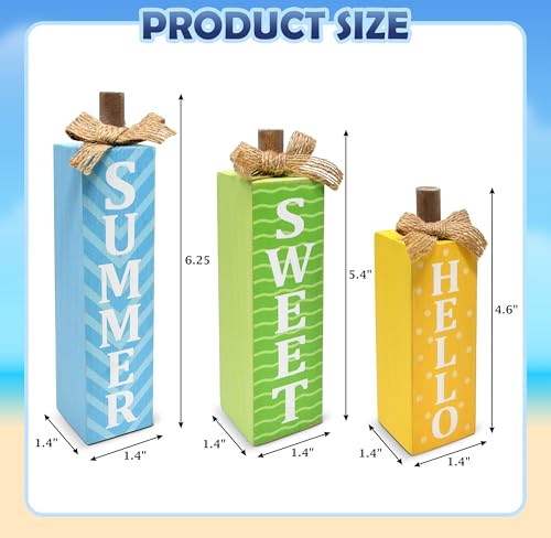 3 Pcs Hello Summer Tiered Tray Decoration Table Block Sign Rustic Farmhouse Wooden Tabletop Centerpieces for Beach Ocean Pool Party Home Decor