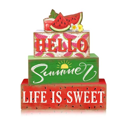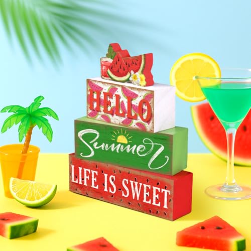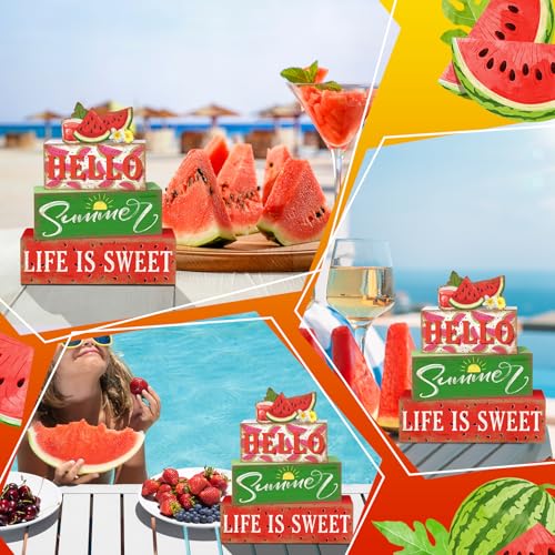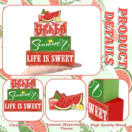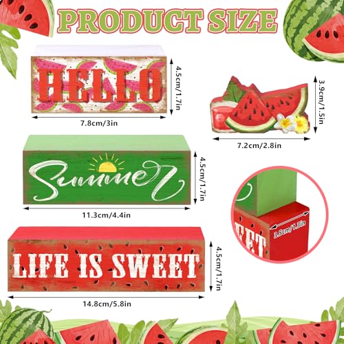 Suitable Sizes: This summer table decor set includes three wooden pieces (5.8” x 1.7” x 1.3”, 4.4” x 1.7” x 1.3”, 3” x 1.7” x 1.3”) and one watermelon decoration. It fits perfectly on tiered trays, tables, and shelves, bringing seasonal charm to any space