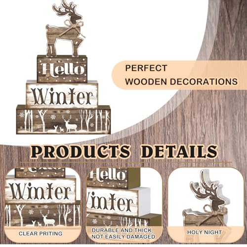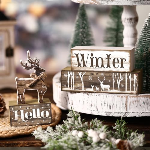 4 Pcs Christmas Table Sign Christmas Wooden Decorative Signage Winter Tiered Tray Decor Winter Centerpieces Farmhouse Wooden Block Set Xmas Table Sign for Home(Elk)
