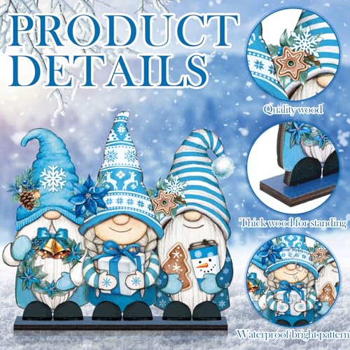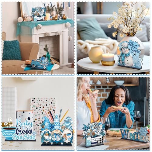 Classic winter Theme: these winter table decorations exude a classic, blue atmosphere, from the lively gnome to the cold snowflake that embodies the essence of winter hue; Winter wooden table centerpiece will bring a wonderful winter atmosphere to your home