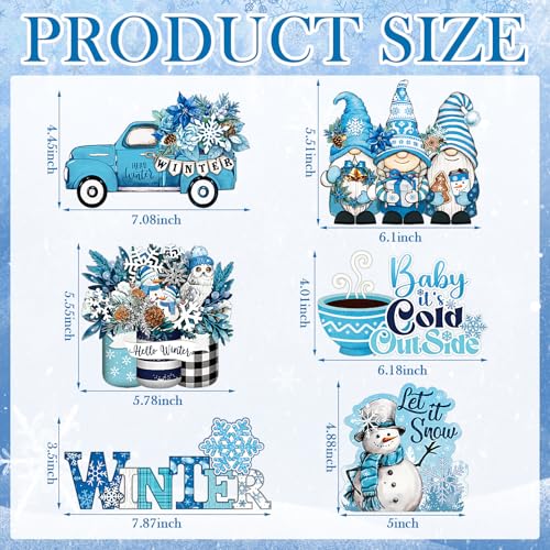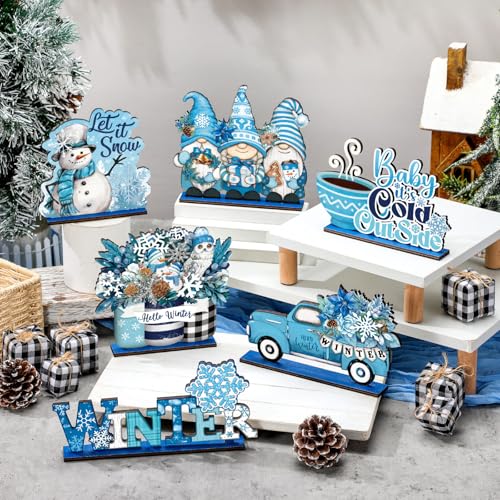 Wenqik 6 Pcs Winter Wooden Table Decorations Blue Wood Tabletop Sign Centerpiece Rustic Winter Snowflake Snowman Gnomes Decorations for Office Desk Farmhouse Home Kitchen Shelves Decorative