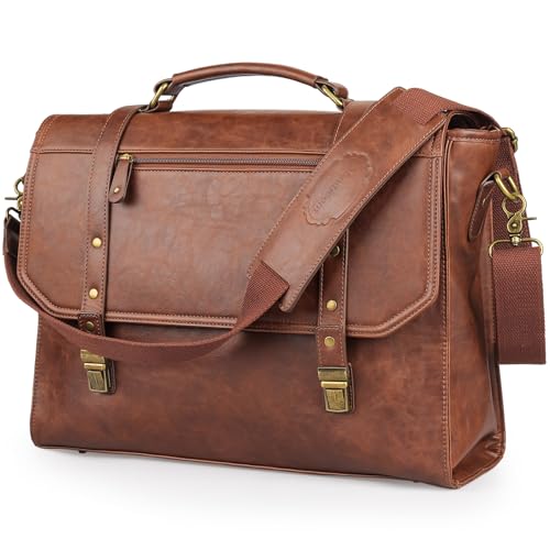 Mens messenger bag 15.6 inch, Waterproof Faux Leather Laptop Briefcase Large Computer Laptop Bag Leather Satchel Bag Retro Shoulder Bag for Office Business Travel College Brown